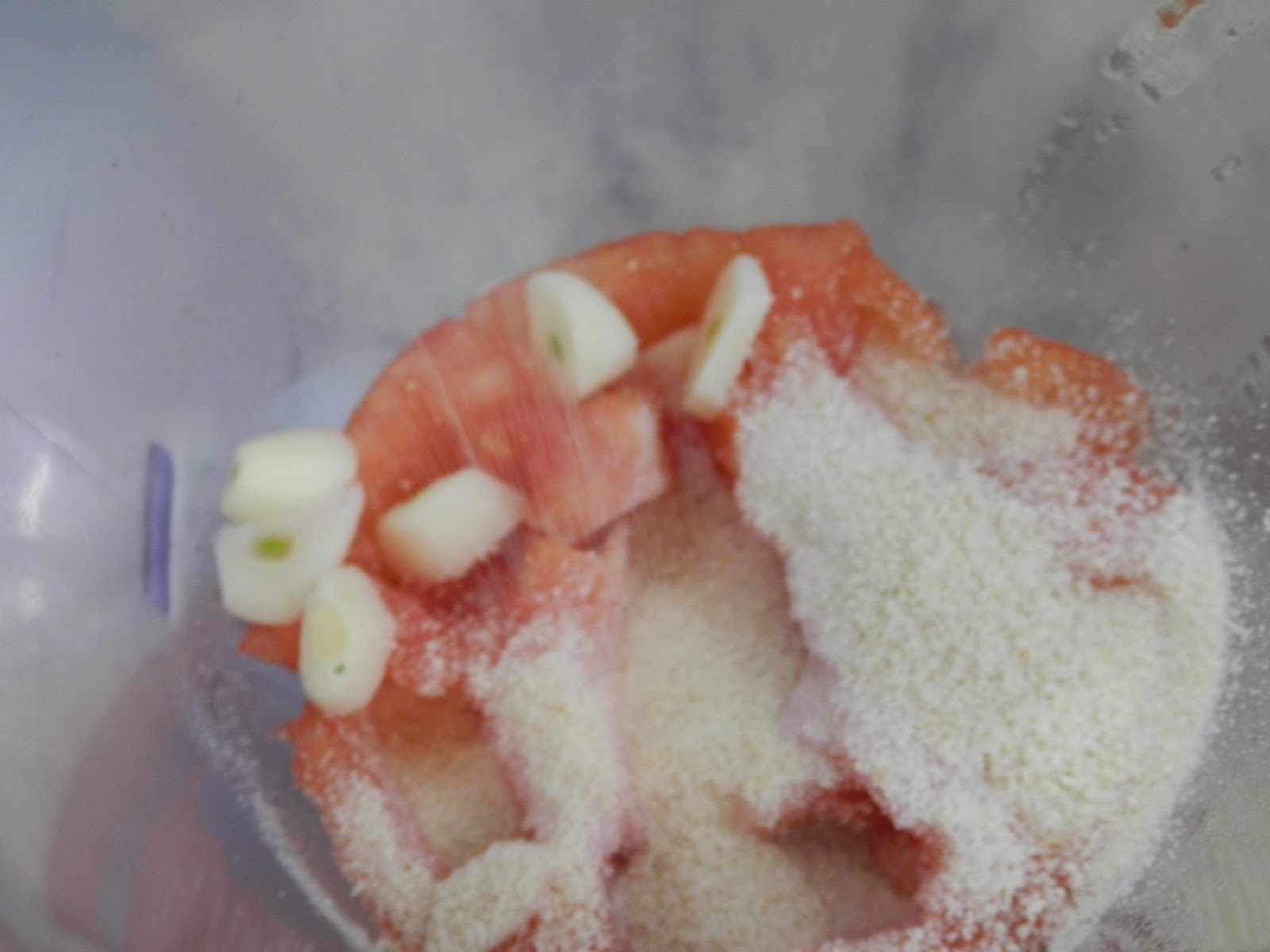 - Tritura con ayuda de la batidora los dientes de ajo con el perejil, el tomate, un poquito de sal y los pistachos.Tapa con film y mete al frigo.